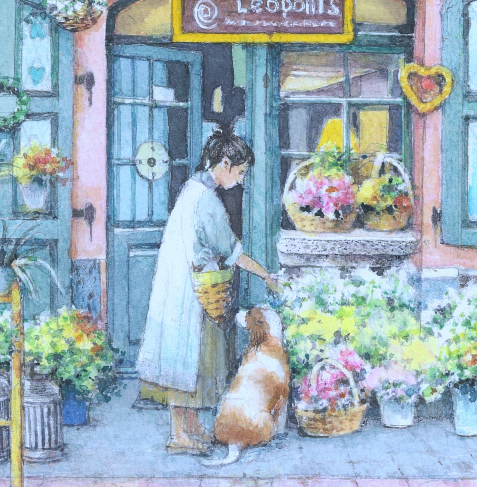 花屋の前で、犬を連れた女性が静かに花を選ぶ――